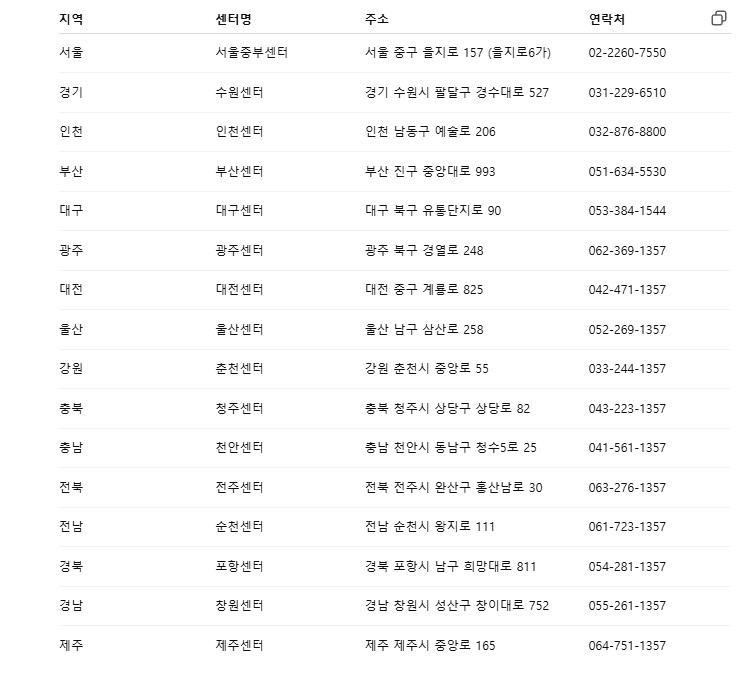 아래는 2025년 기준 주요 광역시·도 센터입니다. 상세 정보는 공식 홈페이지 지역센터 찾기에서 확인하세요.