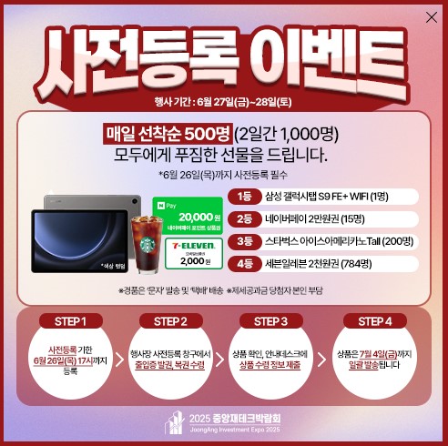 중앙일보 주최의 **‘2025 중앙재테크박람회’**가 오는 6월 27일(금)~28일(토), **세텍(SETEC)**에서 개최됩니다 🎯
